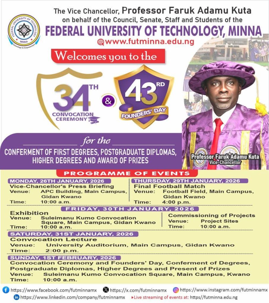 Delivering the 34th Convocation Lecture of the Federal University of Technology, Minna, titled ” Youth and Nation – Building: Navigating Opportunities in Era of National Reforms,” on Saturday, January 31, 2026 at the University Auditorium, Main Campus, dris said President Bola Ahmed Tinubu’s ongoing national reforms including subsidy removal, FX unification, new tax laws, and youth focused initiatives such as NELFUND, 3MTT, and the Nigeria Startup Act are creating new opportunities for young Nigerians.